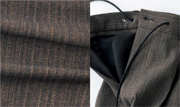 抜群の伸縮性を備えるナイロンベースのジャージー素材にファブリックパターンを転写プリントすることで、ファブリックと見紛う表情を備えるプリントジャージー。新しいセットアップはメランジ調のヘリンボーン生地をプリントし、温かみのあるこなれた雰囲気です。家庭用洗濯機でも水洗いが可能であり、ウエストの締め付けを軽減するサイドシャーリングや、内側でも外側でも結べるコンバーチブルコード、半永久クリースなど他の機能も満載。