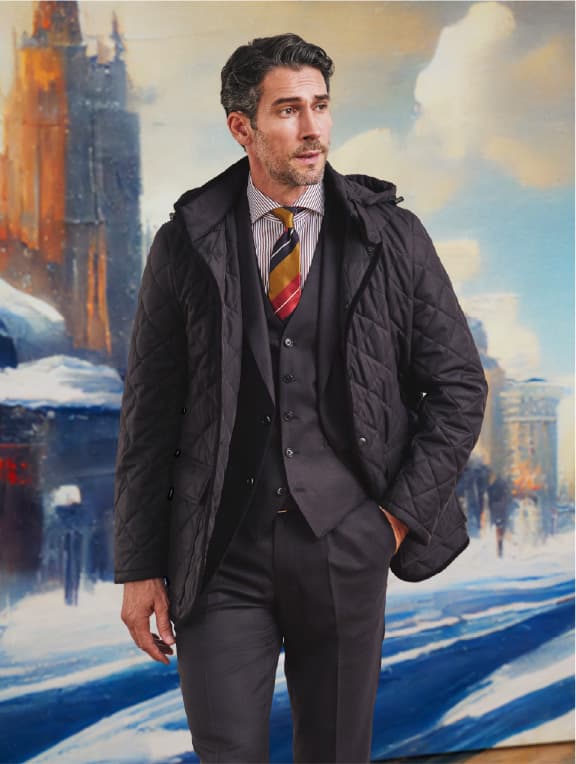 乗馬用コートをアレンジした軽く暖かいキルティングコートは、表地にナイロン系の生地を用いるのが一般的。オンリーは西川毛織と共同開発したウールベースのスーツ地を用いることで、よりシックで高級感のあるキルティングコートに仕上げました。颯爽とした雰囲気のスタンドカラーで、フードは着脱可能。襟と縁にパイピングしたコーデュロイもブラックで都会的な雰囲気に。同素材のスリーピーススーツとコーディネイトすれば、変則フォーピースとしても着こなせます。