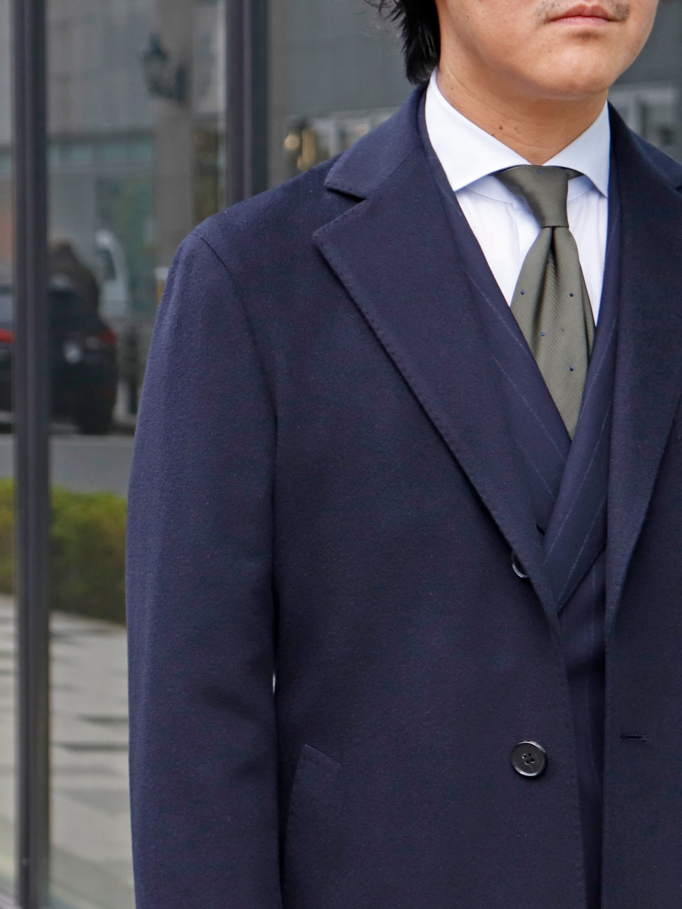クラシックなコートの代表格といえば、チェスターコート。大人な印象を醸すダブルブレストのスーツとの相性は明白です。