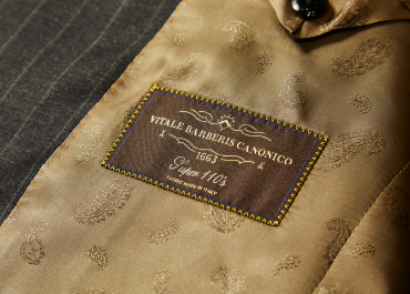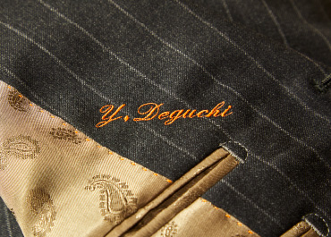 生地はイタリアで350年以上の歴史を誇る名門「ヴィターレ・バルべリス・カノニコ」のウール。スーパー110'sという繊細な羊毛を使用することで、なめらかさと上質な光沢を叶えているのが特徴です。裏地は出口さんが好きな色だというオレンジがかったベージュのペイズリー柄。シックな表地とは一転、“裏勝り”に仕上げました。