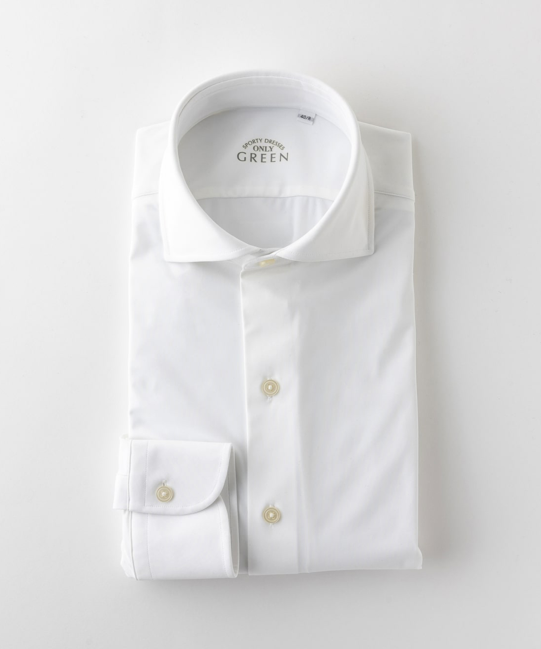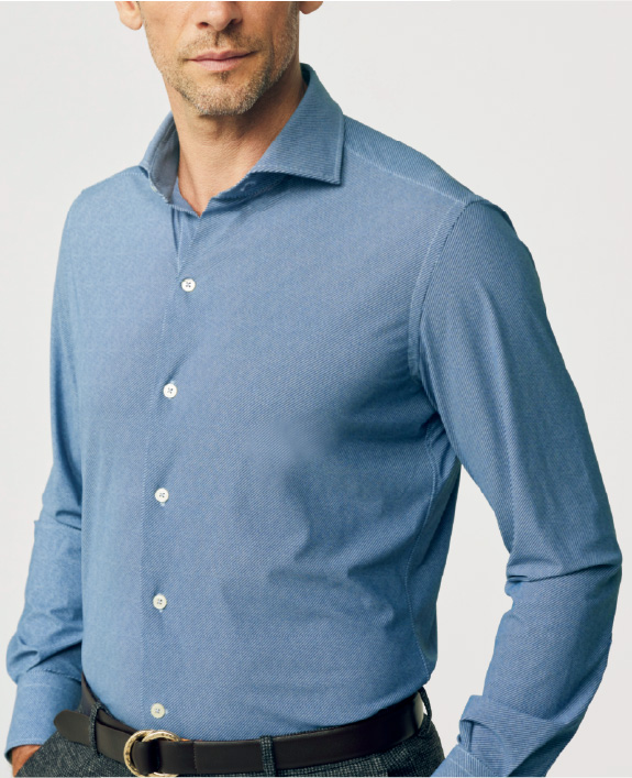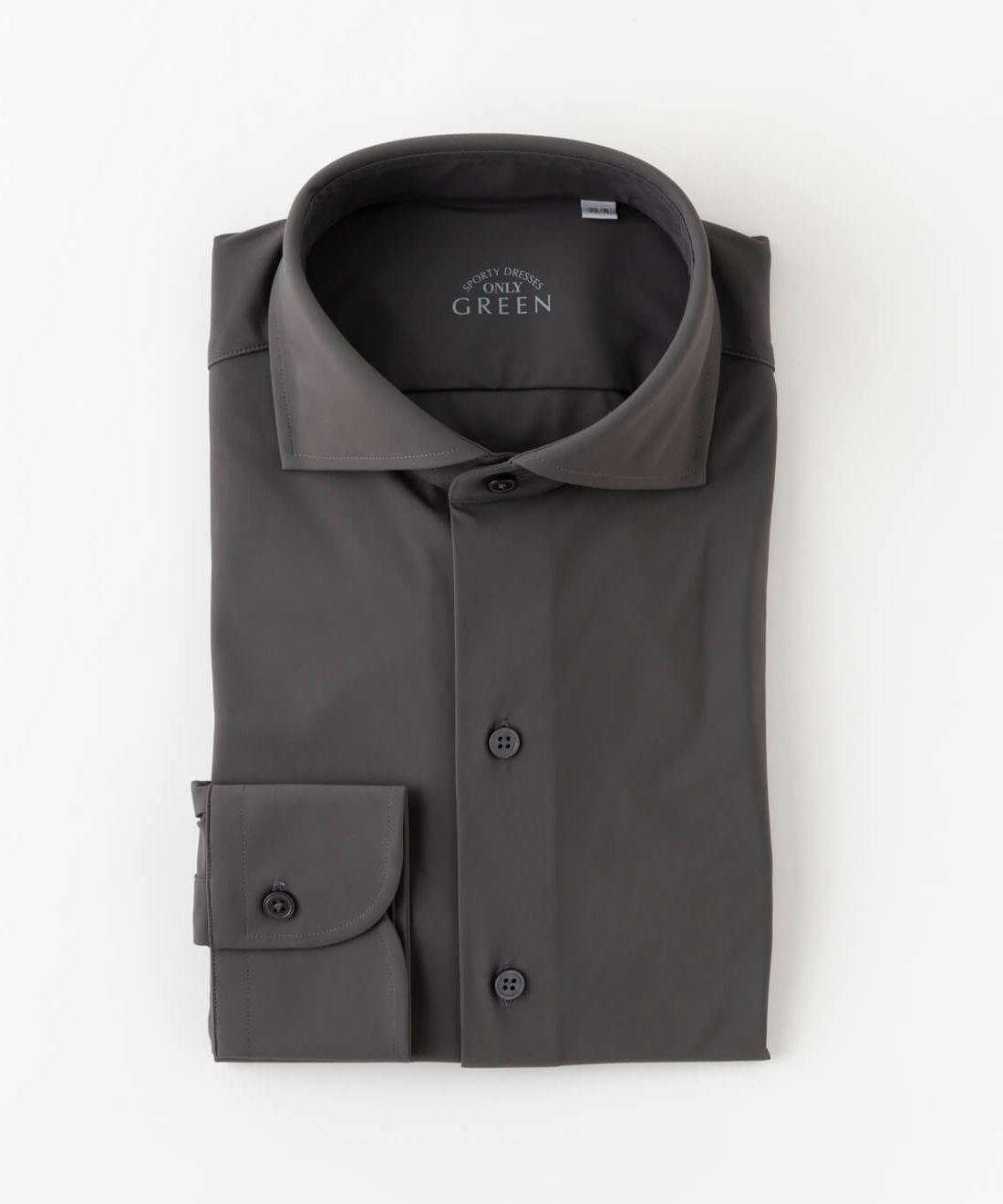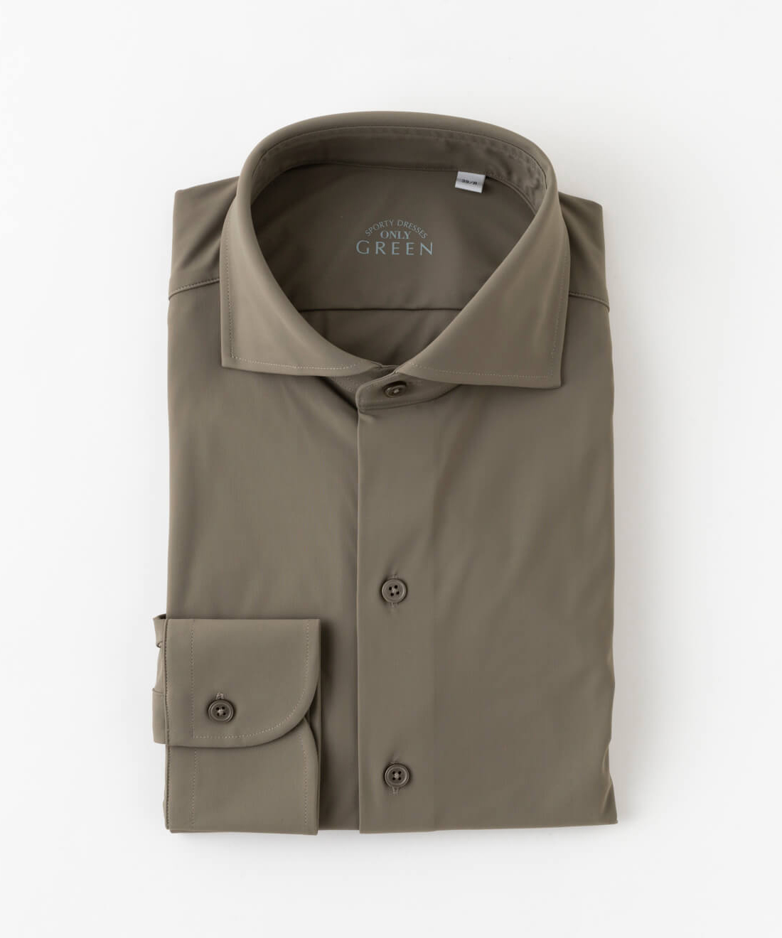 抜群の伸縮性を備えるナイロンジャージー製ドレスシャツ。今季はダイアゴナル柄プリントやオリーブカラーが加わりました。