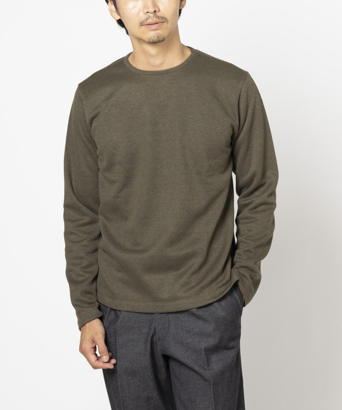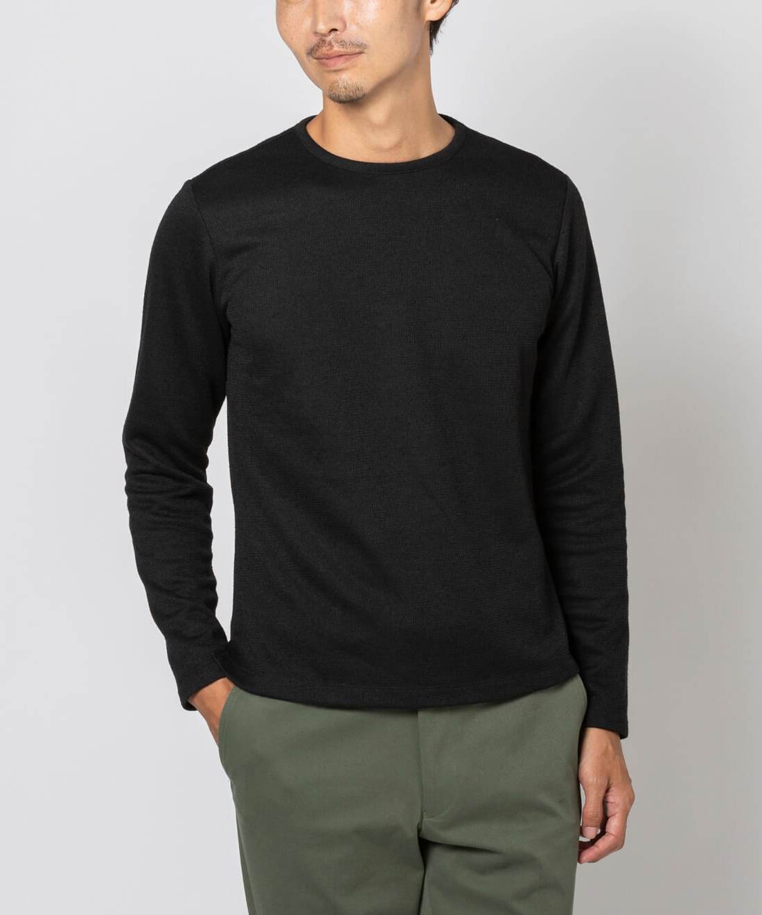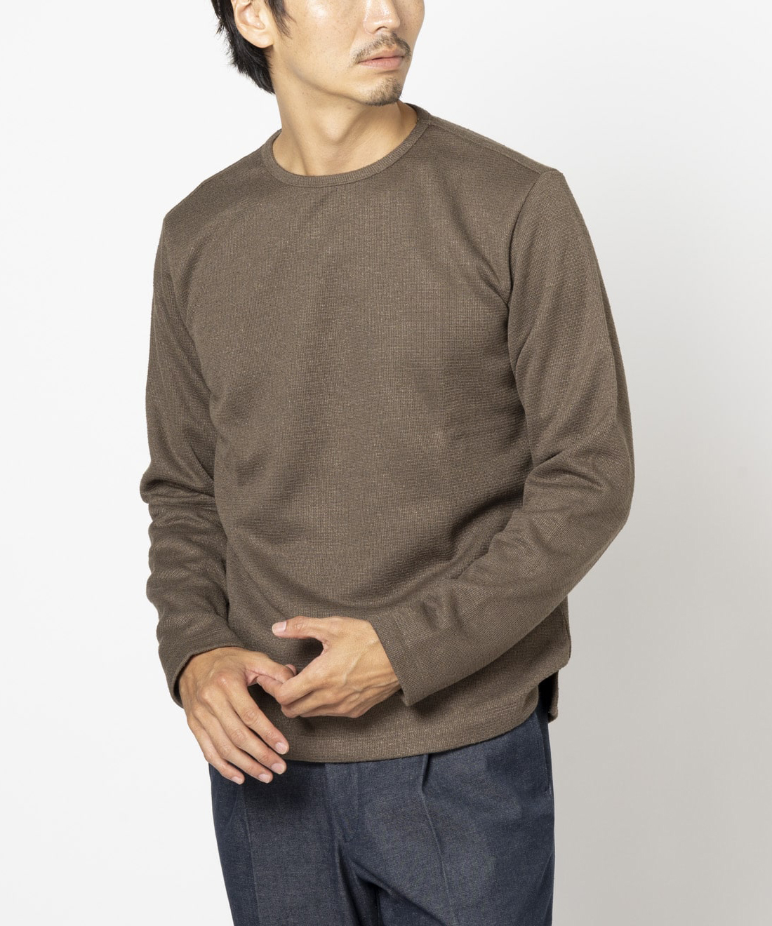 裏起毛による保温性を備えた、ポリエステルレーヨンジャージーのテーラーズTニット。ニット見えする温かみのある表情も秋冬に最適です。