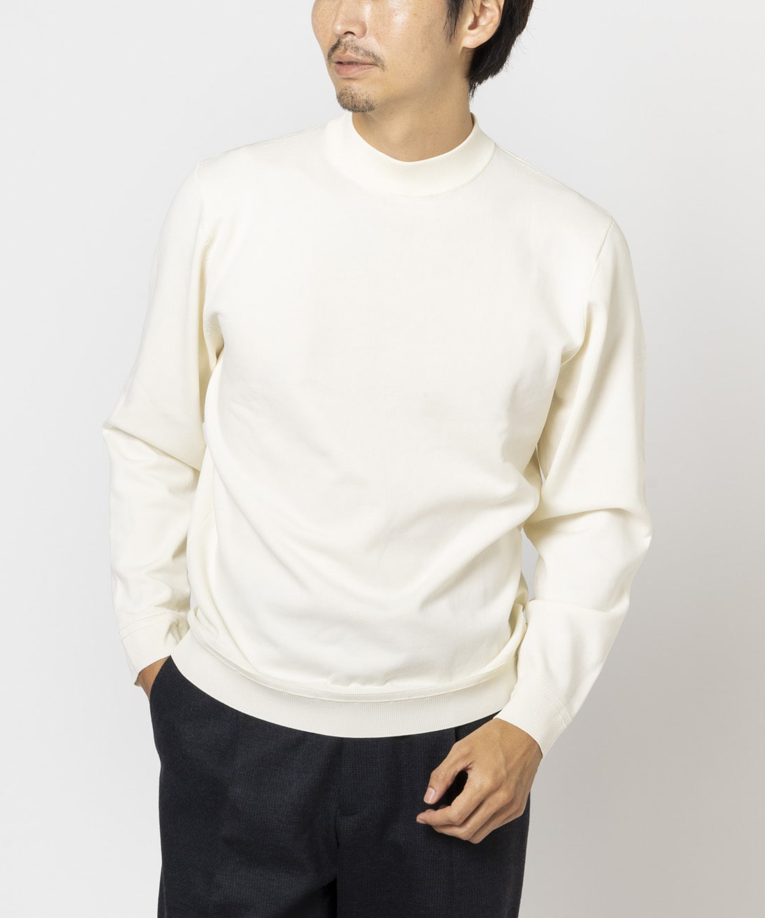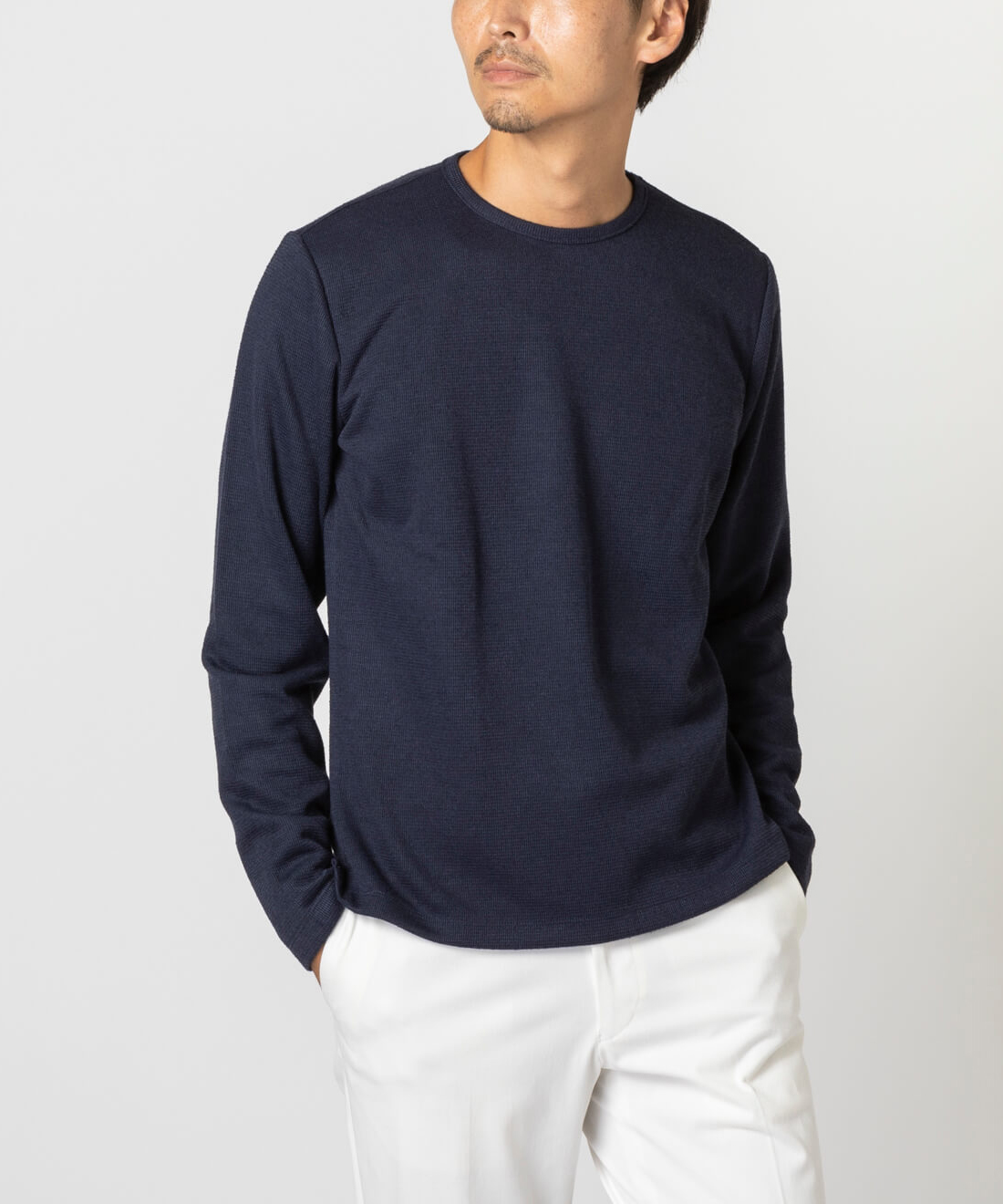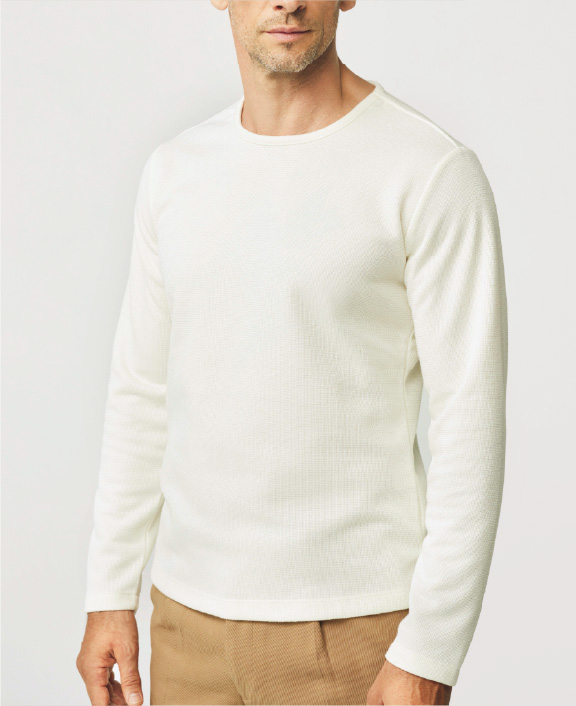 裏起毛による保温性を備えた、ポリエステルレーヨンジャージーのテーラーズTニット。ニット見えする温かみのある表情も秋冬に最適です。