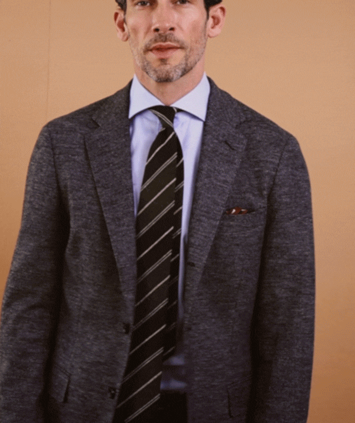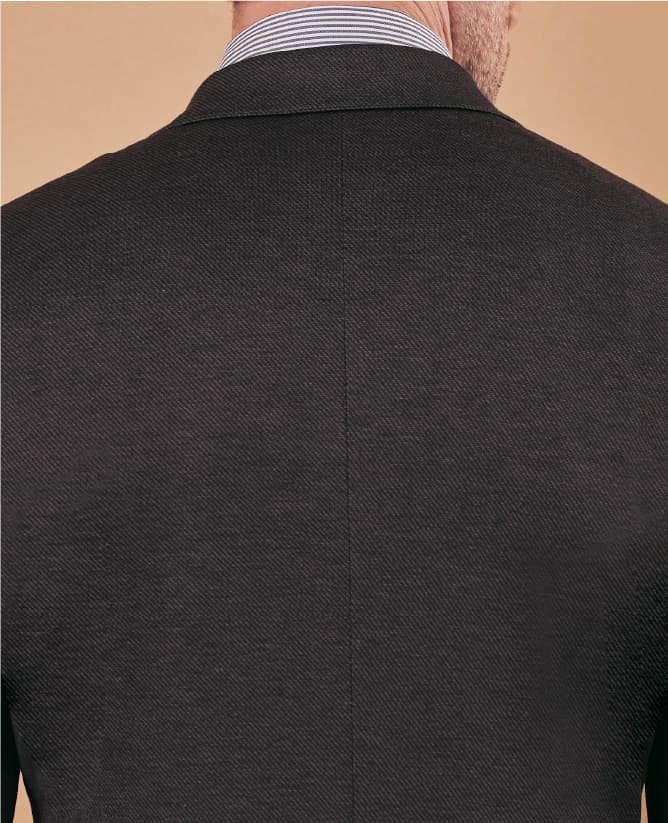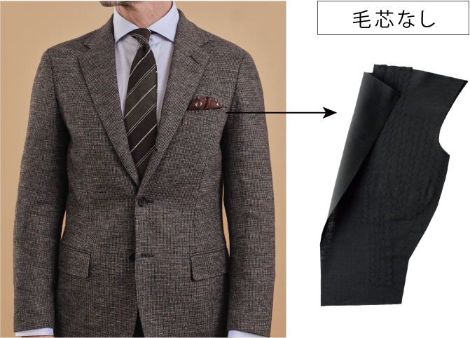 織り地よりも糸を多く要する編み地であるジャージーは、どうしても生地自体が重くなります。そこでオンリーのなかで最軽量仕立ての「サンタルチア ゼロ」モデルを採用しました。毛芯を使わず、薄い接着芯を一枚貼るのみの画期的仕立てで、同じ生地で仕立てた際に比べると、従来の毛芯使用に比べ、約130gも軽量な仕上がりに。