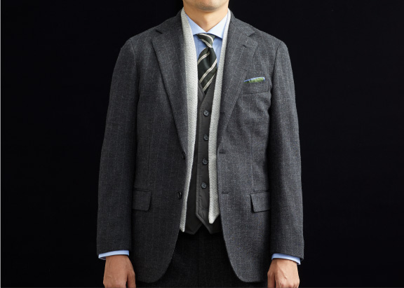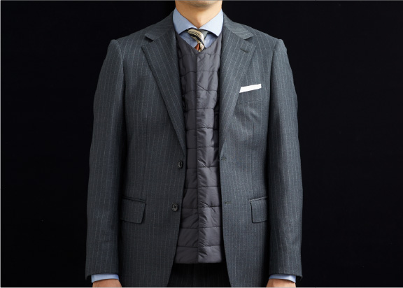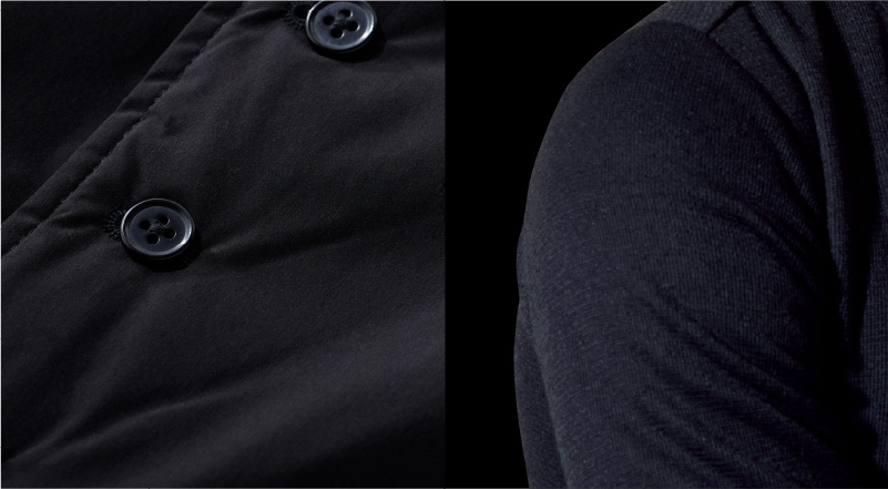 テーラードのノウハウを駆使した体に沿う立体的なフォルムに加え、スーツやジャケットのインナー使いを前提として素材感や色、デザインを厳選。防寒性を考慮した機能性にも注力しました。暖かいのはもちろん、ビジネススタイルに不可欠な上品さやきちんと感もキープできる、テーラーにしか作れない自信作です。