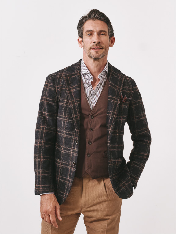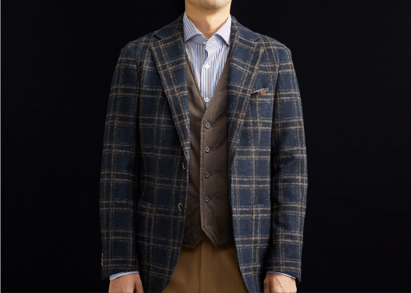 ベストと同様に、ジャケットのインナーとして着ることを前提とした独自のパターンを採用。ジャケットを羽織った際、すっきりとバランスよく収まります。
