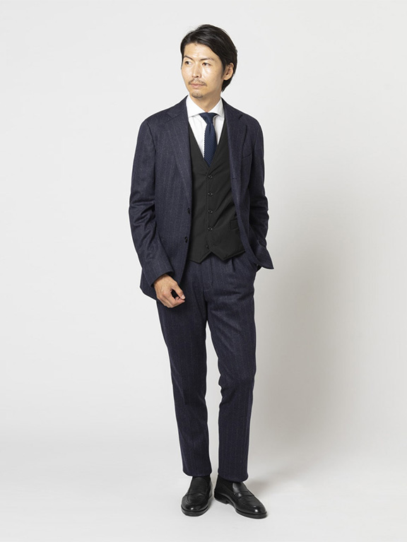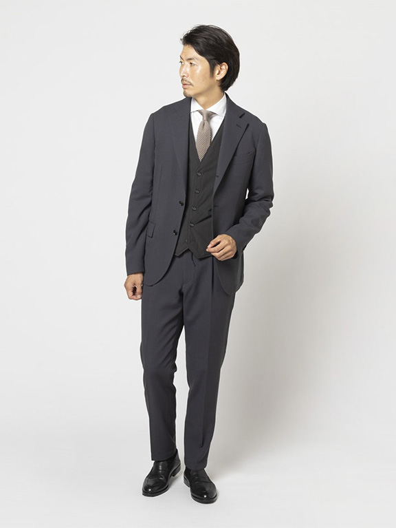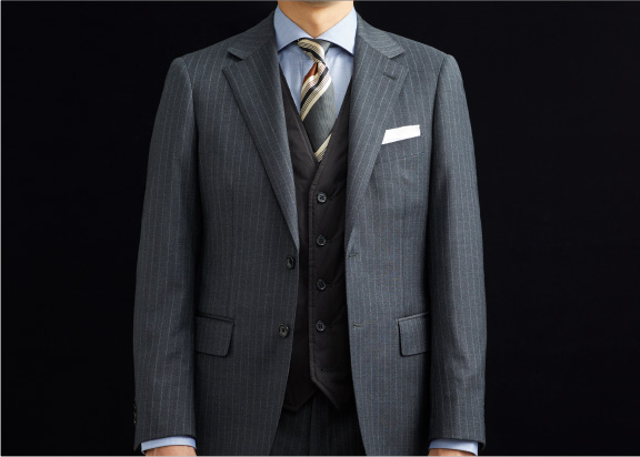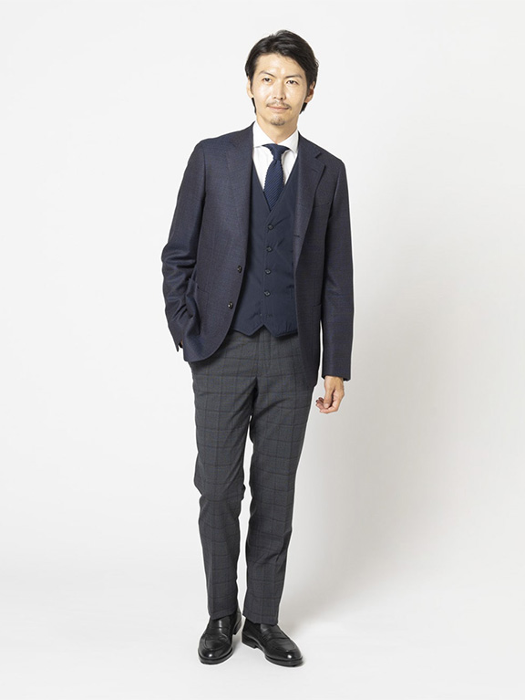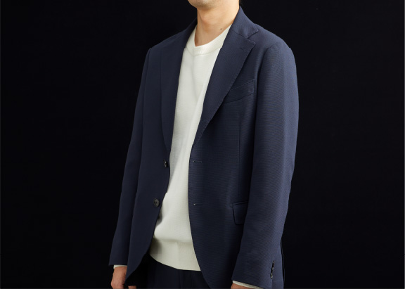 テーラーのノウハウを集約したパターンを採用し、細身ながら立体的フォルムで体に沿うため、スーツを着てもかさばらずきれいに収まります。収まりの良さはスーツの構造を熟知するゆえでもあるのです。