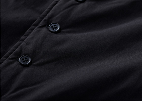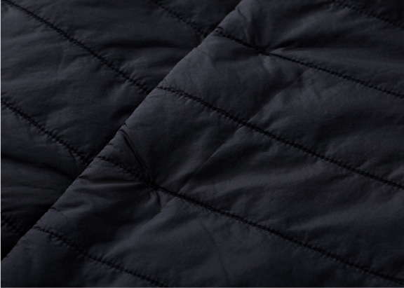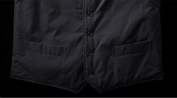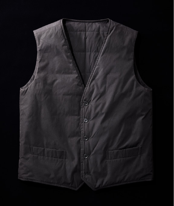 テーラーズベストの表地には、光沢を抑えたコットンライクなポリエステル素材を採用。中綿を押さえるキルトステッチも内側に配したためスポーティにならず、ビジネスウェアに馴染む上品な表情に仕上げました。