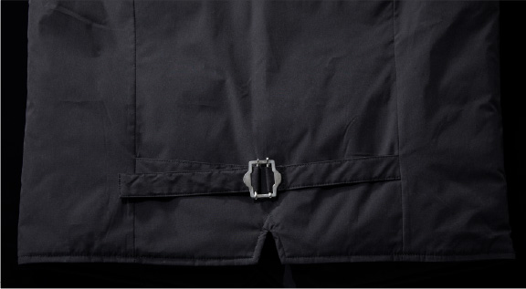 フロントはいわゆるドレスカットなので、見た目にもエレガント。また通常のベスト同様バックシンチも採用し、ウエストのフィット感を絶妙に調整できます。