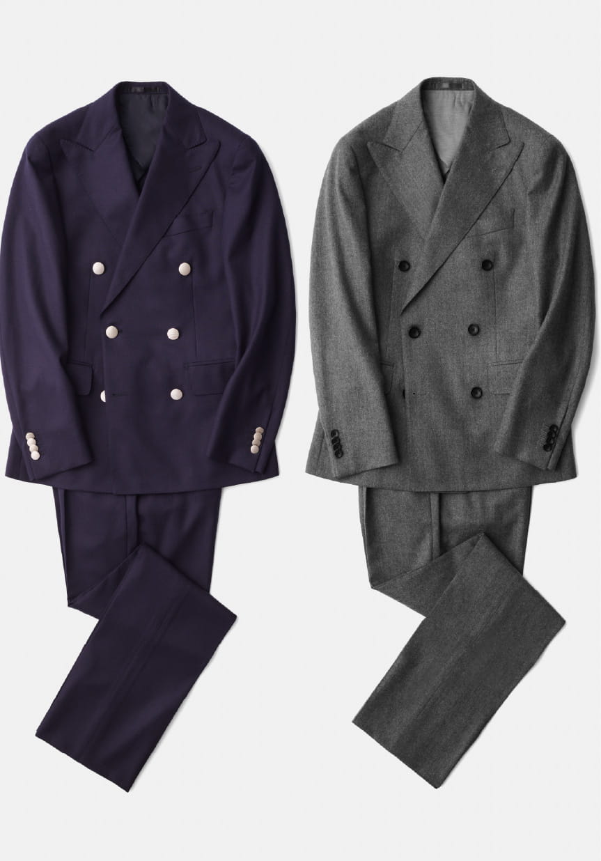 「ダブルブレステッドのブレザーのセットアップにすることでジャケット単体でもパンツ単体でも使いやすいアイテムにしました。オーダーはつい盛り過ぎてしまうので、引き算の要領でなるべくシンプルにしていくのが正解ですよ」(梶谷さん)