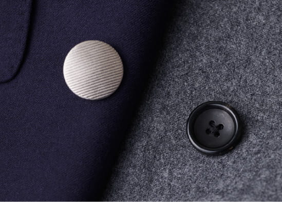 ネイビーブレザーは金ボタンが多いですがクラシックな印象になるので今回はシルバーでモダンな印象に。グレーブレザーはボタンの主張を抑えるためにブラックのホーンで、高級感をプラス。