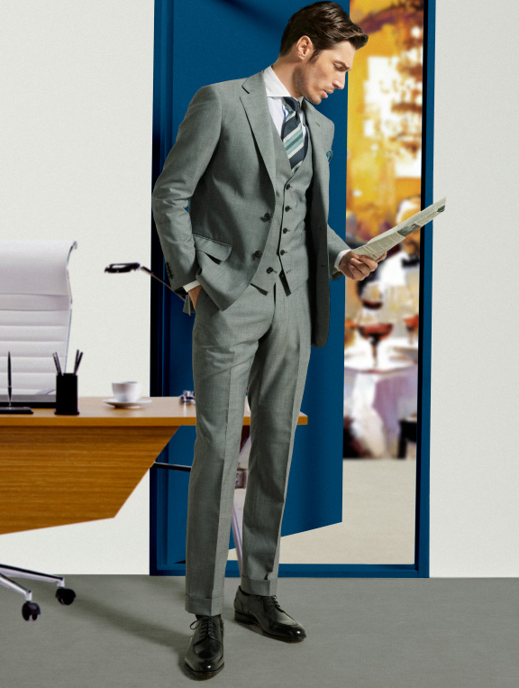 スーパーソニックが支持される理由のひとつであるやや強めの光沢は、スーツに華やかさを添えてくれます。そしてコーディネイト次第で、セレモニーシーンでも洒脱に映えるはず。タブカラーの白シャツにブルーサテンのドットタイ、白のリネンチーフはビジネスでも通用する合わせですが、上級者的な洗練されたフォーマル感を醸し出せます。