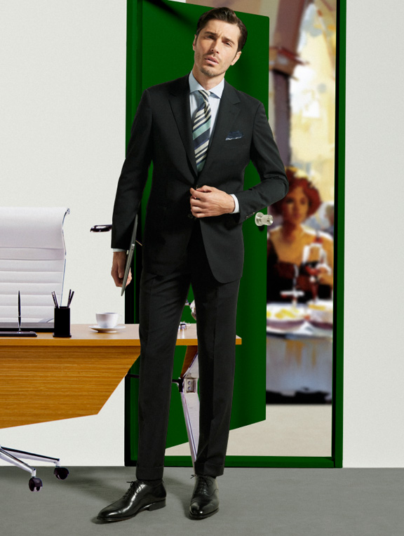 ロロ・ピアーナのファブリックのなかでも、高い機能性と気品でビジネスマンに根強い人気を誇るのが、ニュージーランド産メリノウールを用いた「ジランダー」。とりわけ通気性に優れた平織りのナチュラルストレッチバージョンは、日本の夏にも最適です。深みのあるブラックは、Vゾーンをブルー系でまとめ、シックかつ涼しげに着るのが現代的。