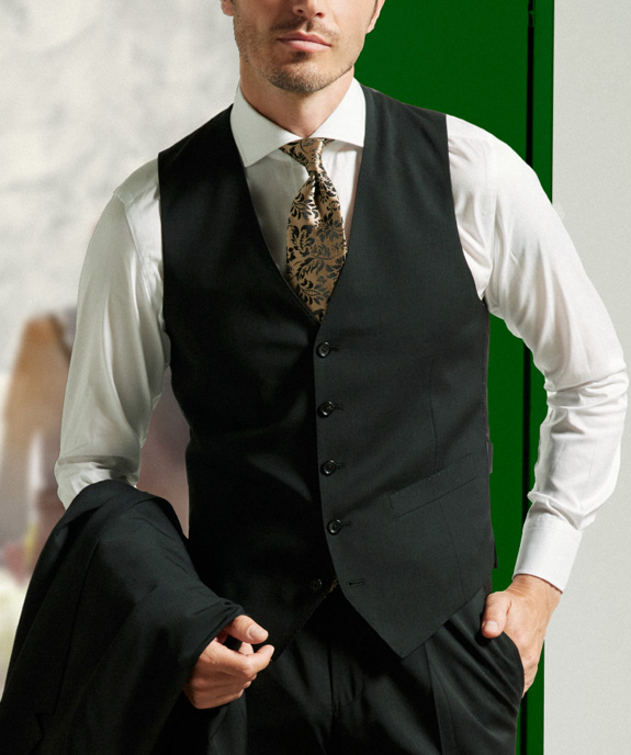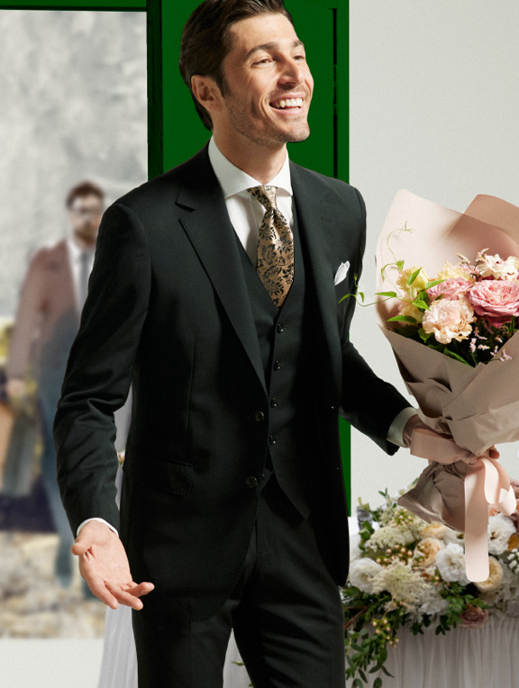 ジランダー採用のブラックスーツは同素材の別売りベストをご用意し、スーツと組み合わせれば3ピースでも着用可能。上質メリノウールならではの上品な艶と深いブラックも相まって、ドレッシーなセレモニーウェアとして活躍します。フォーマルな白シャツとゴールドカラーのジャカードタイを合わせれば、控えめな華のある大人の晴れ着に。
