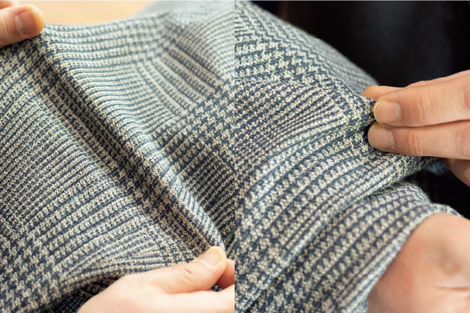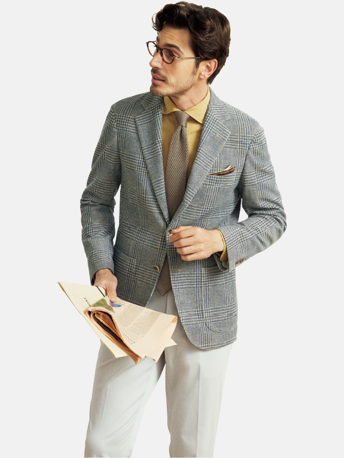 正統派のグレンチェック柄ジャケットは一着備えておくと重宝するワードローブですが、かっちりしすぎて着にくい印象も。その点、イタリアの老舗ローマ社の生地はベージュ×ネイビーで堅すぎず、着やすい表情。しかもジャージー素材にプリントで柄を表現したものなので、とても快適です。またこなれた雰囲気もあり、カラーシャツやニットタイなどのカジュアルで軽やかなアイテムとの相性も申し分なしです。