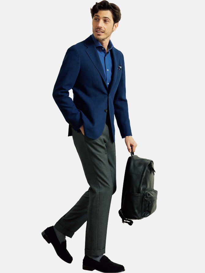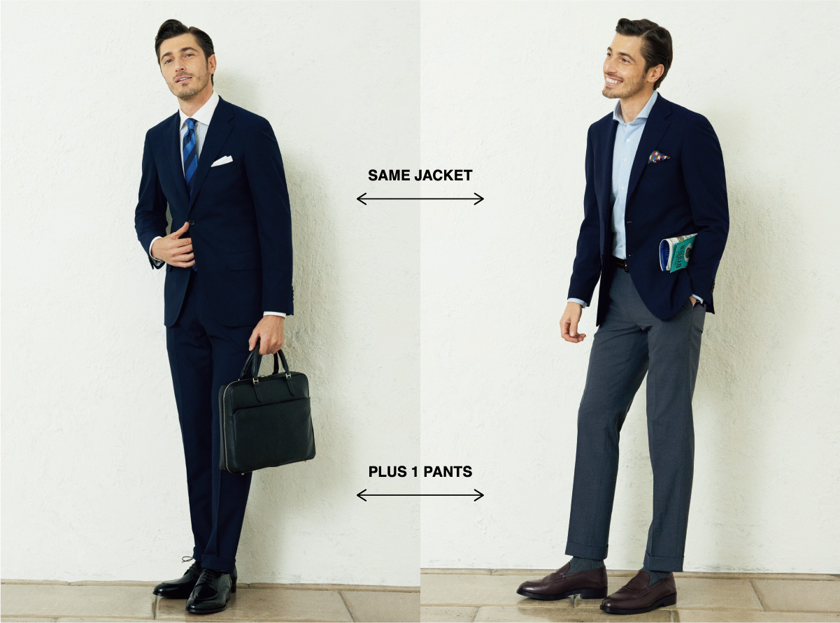 ネイビーソリッドのセットアップとグレーの単品パンツという、最もベーシックにして毎シーズン高人気をキープする最強セット。今季はポリエステル混率を変更し、よりシワになりにくく、強度もアップ。縦横ストレッチも兼備。それぞれ組み合わせても単品でも、まさに無限大の着こなしが可能です。