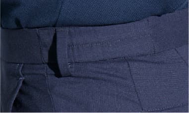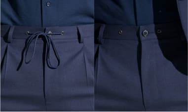 ウエストベルトの両サイドにラバーバンドを内蔵し、締め付け感のない着心地。正面からは見えないので、ビジネスに不可欠な上品さもキープ。