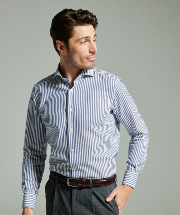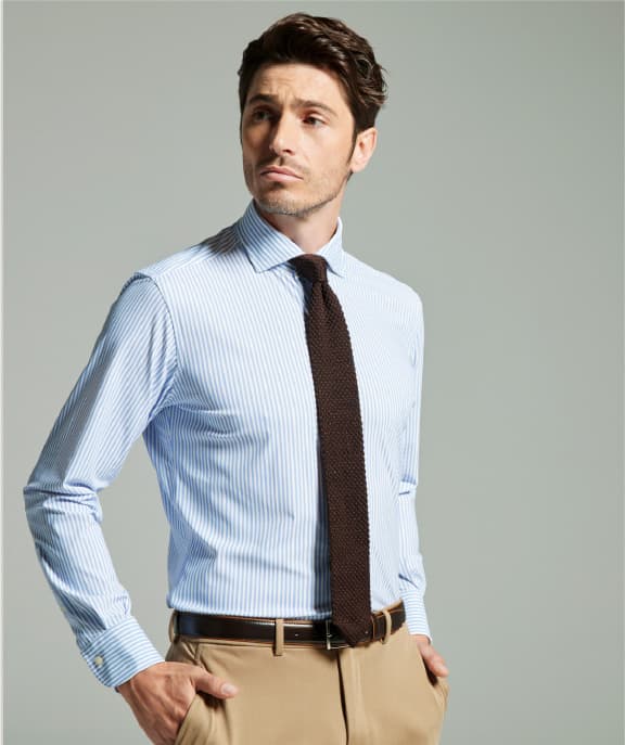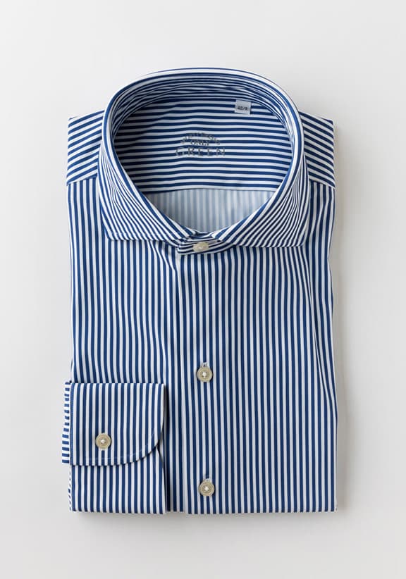 日本人体型に合わせてやや前側に振った後付け袖をはじめ、肩を立体的に仕上げるいせ込みや上品に見える細かな運針など、イタリア仕込みの技を駆使したイタリアンテーラリングシャツ。洗濯に対する耐久性も考慮されており、頻繁に洗う夏場も安心です。白やサックス、ストライプの絡み織りが揃います。