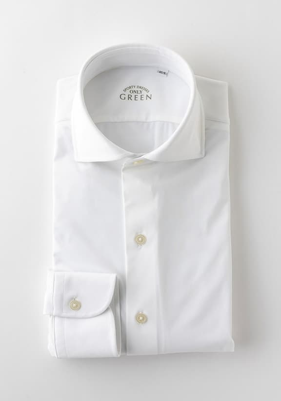 軽スポーツも可能な伸縮性“スポーティ ドレッシーズ”をコンセプトに誕生したオンリー グリーンは、ドレッシーながら仕事帰りの軽スポーツをそのまま楽しめる機能性を備えたアイテムが揃います。そのシャツは抜群のストレッチ性を備えたナイロンジャージー製で、スポーツウェア並みの動きやすさ。吸湿速乾性やノンアイロン機能も備えています。また、ビジネスシーンで第一ボタンを開けた際、胸元が程よく開くように第二ボタンの位置が絶妙に計算されています。