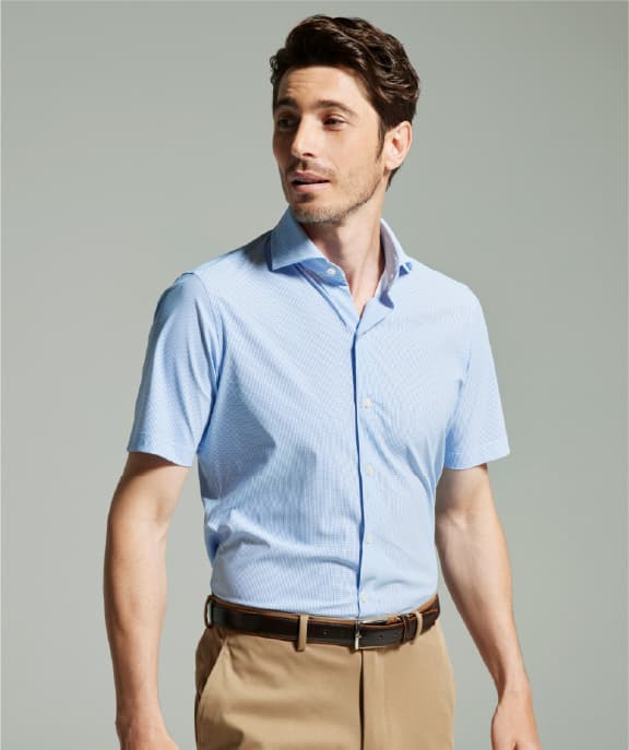 雨が多くなるこれからの季節、一枚あると重宝するのが撥水加工を施した高機能シャツです。雨の日も雨染みになりにくいのに加え、速乾性やストレッチ性で快適さもキープ。抗菌防臭や防汚性能も備えているので、夏に気になる清潔感も保てます。さらにノンアイロンでシワになりにくく、洗いざらしでもきちんと装えるのもポイント。一枚で着ることを前提としたワンポケット&ショートスリーブ仕様です。