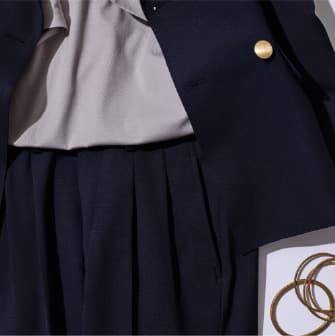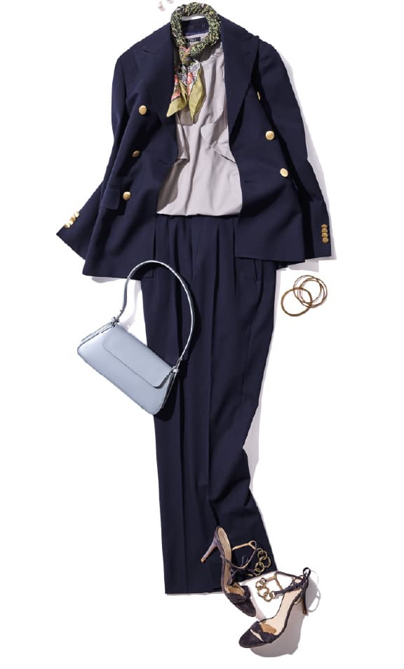 「こちらの紺ブレには、同素材のパンツもラインナップしているので、せっかくならセットアップで持っておくと便利だと思います。定番のネイビースーツより、紺ブレのセットアップスーツは遊びがあるので、スカーフやブラウスとの相性も良いですし、Tシャツやスニーカーなどと合わせて、カジュアルに着崩すのもオススメです。きちんと感がありつつも、華やかで今っぽい印象を醸しやすく、仕事だけでなくハレの日にも使いやすいと思います。パンツもタック入りなのではき心地も抜群」(梶谷さん)