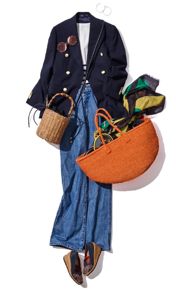 「ビーチや山に旅行に出かける際、一枚羽織物があると便利ですが、そんな時も紺ブレがオススメ。デニムとの相性も良く、Tシャツやカットソーに羽織るだけで、大人っぽいきちんと感を出すことができます。ホテルにチェックインする時やディナーなど少しドレスアップしたい時にぴったり。ライナーも素敵なので、腕まくりしてチラ見せするのもお洒落ですね。シワにもなりにくいので、この夏は紺ブレと一緒に旅に出てみてください」(梶谷さん)