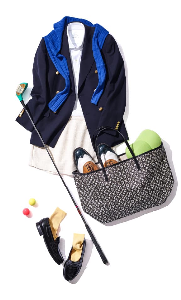 「大人の趣味といえば、ゴルフ。最近はドレスコードが厳しくないゴルフ場も増えましたが、ジャケットを羽織ってチェックインするのが大人の嗜み。そんな時にもこの紺ブレはオススメ。シルエットもタイト過ぎず丈感も少し長めなので、ショートパンツやミニスカートに合わせてもバランス良くまとまります。今回は、ミニスカートに合わせて、スポーティながら品のある肌見せコーデにしてみました。インナーにものすごくストレッチが効いたポロシャツを合わせたので、運転もプレーものびのびこなせると思いますよ」(梶谷さん)