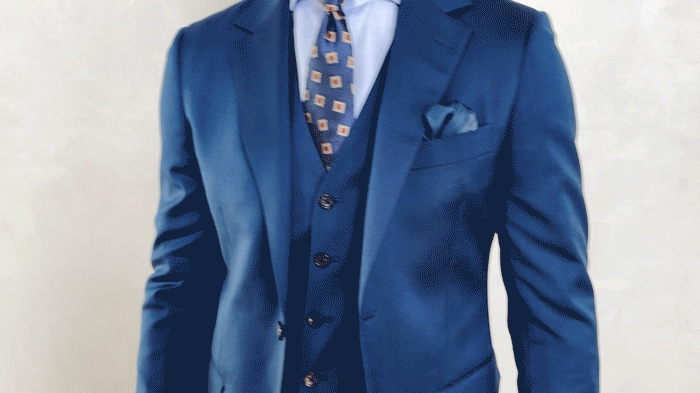 光沢感がより際立つ、ネイビーソリッドのスリーピーススーツ。正統派のVゾーンでかっちり見せることはもちろん、こんなタイやチーフで色柄を効かせた遊び心のあるスタイリングも可能です。