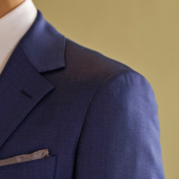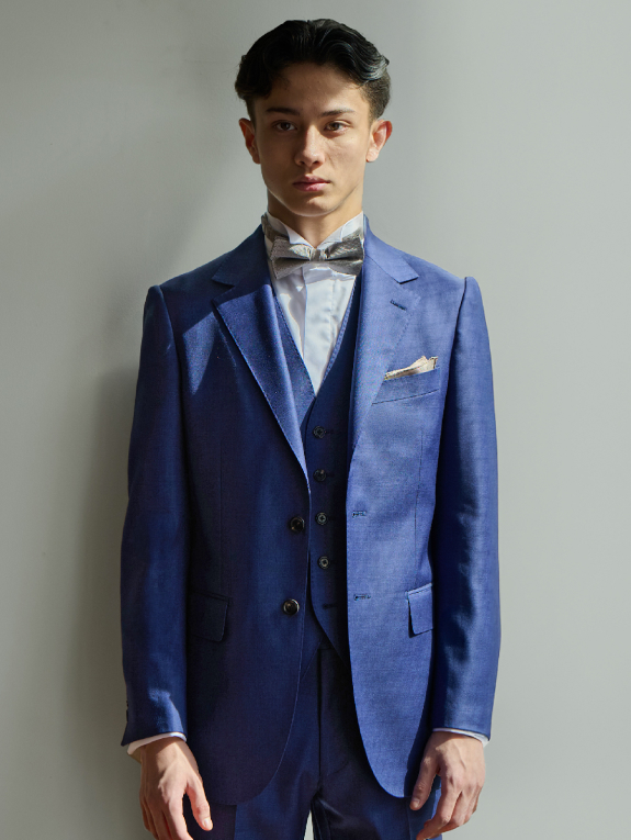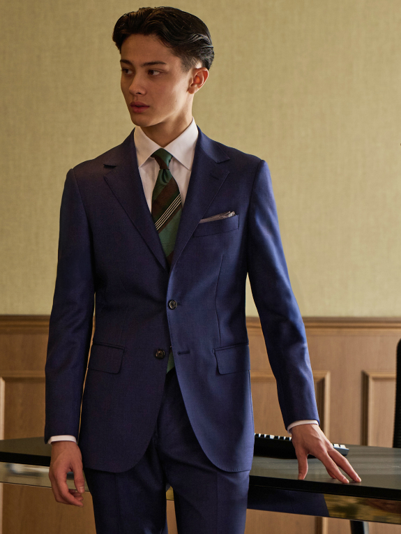 - デザインはフレンチテイストを取り入れた「ロンシャン」モデルをベースにしたシャープなフォルム。切れ込みが浅いフィッシュマウスラペルや、立体的な肩周りなど端正な造形美がフォーマルスタイルにも好相性。華やかなブルーをはじめ、ネイビー、グレー、ブラウンなど計6色展開です。