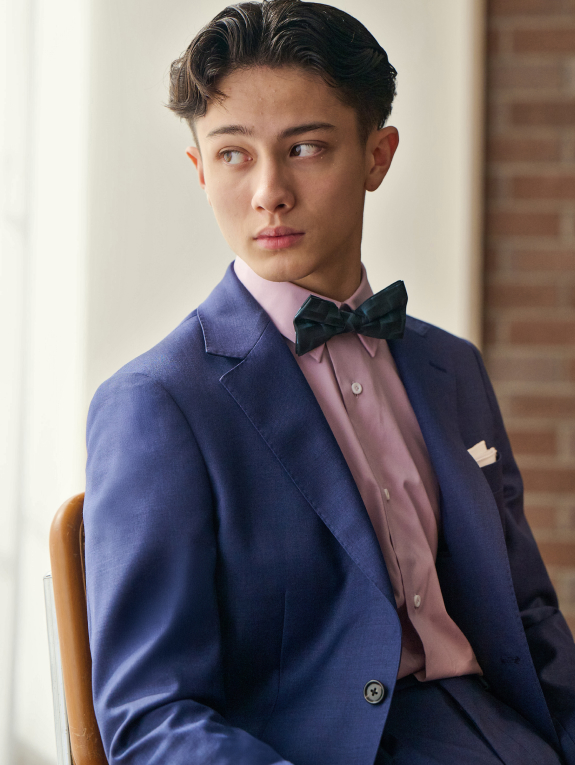 - 結婚式に定番の白ウイングカラーシャツとグレージュの明るい蝶ネクタイを合わせて、フォーマル度を高めたブライダルスタイリング。スーツの色合いが明るい分、インナーはオーソドックスなアイテムでバランスを取り、華やかながらも落ち着きのある大人の佇まいに。また別売りのベストと一緒に着用することで、よりフォーマルなスリーピーススーツとしても活躍します。