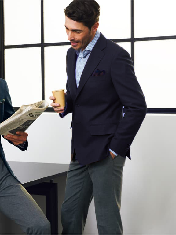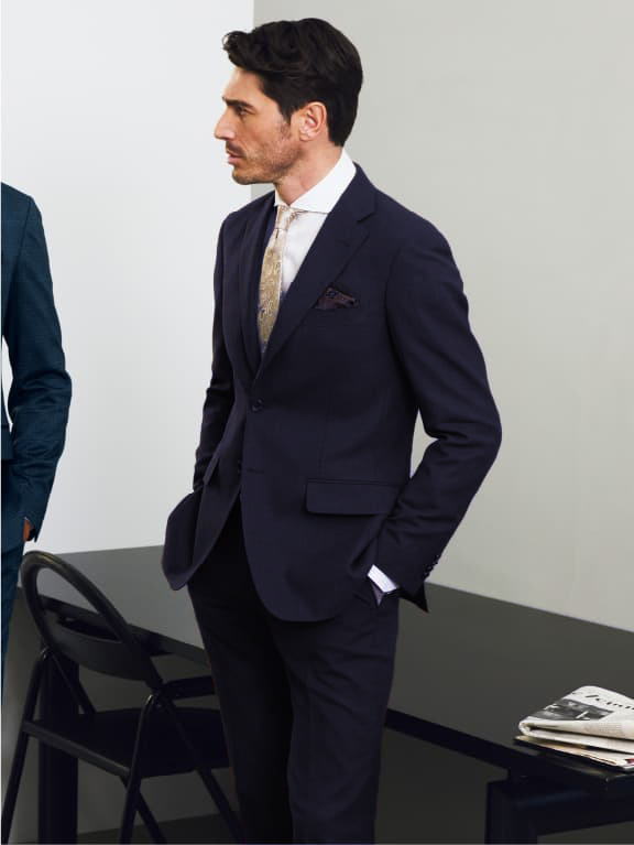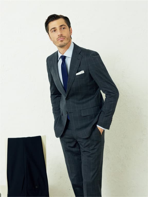 ネイビーソリッドのセットアップとグレーの単品パンツという、最もベーシックにして毎シーズン高人気をキープする最強セット。生地はウールポリエステル素材でシワにもなりにくく、耐久性にも優れます。縦横ストレッチも兼備。それぞれ組み合わせても単品でも、まさに無限大の着こなしが可能です。