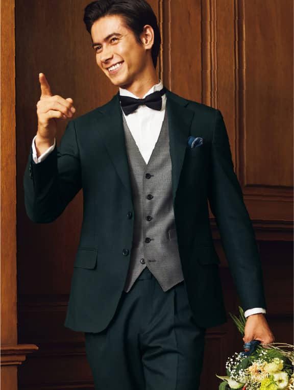 「ウィングカラーシャツにボウタイ、グレーベストというフォーマルアイテムも難なくコーディネイトできるのが、オンリーのビジネスセレモニースーツの利点です。スーツ以上、タキシード未満の雰囲気で、結婚式や各種発表会など意外と重宝するはず」