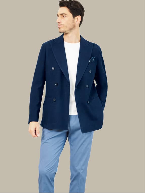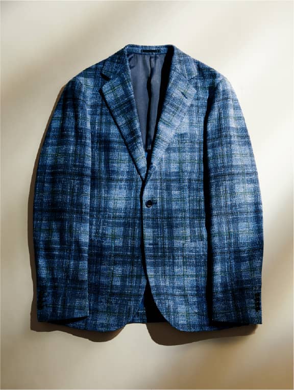創業は1956年と老舗ながらも、新しい素材であるジャージーを得意とするイタリアのラニフィーチョ ローマ社。ポリエステルコットンを用いたブルーのチェック柄プリント素材は、ジャージー特有の重みがなく、サラリとした軽やかな風合いです。ツイーディなメランジ調で涼やかな表情は、とてもプリントには見えません。芯地類を用いない「サンタルチア ゼロ」モデルにより、軽快な快適さを存分に味わえる仕上がり。