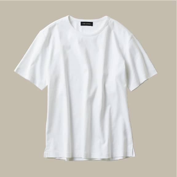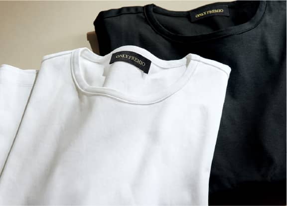 すっきりと収まるウエストシェイプや前肩袖、上品な共生地のパイピングネックなど、ジャケット&スーツに合う設計を徹底追求した「テーラーズTシャツ」に上質なプレミオモデルが加わりました。特殊加工で膨らみや柔軟性、光沢をもたせ、シワにもなりにくい特別なコットン生地を用いた自信作です。