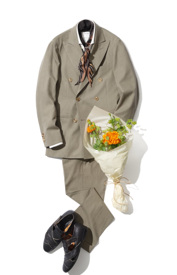 華やかさはディテールで演出するのがお洒落に魅せるコツ。ピークドラペルのジャケットや、ベルトレスのパンツを選んだり、きれいな色のシャツ、柄のチーフやスカーフ、ボウタイなど合わせる小物で華やかさを演出しましょう。