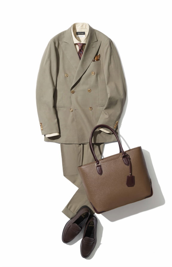コットンスーツなので、タイドアップスタイルは少しカジュアルな着こなしに。ベージュシャツやローファーを合わせた、ちょっぴりアメトラっぽい着こなしもお洒落にまとまります。シャツ、タイ、チーフ、シューズなどすべてブラウン〜ベージュでコーディネートすると、簡単にセンスの良いスタイルが完成しますよ。