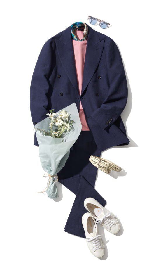 素材で遊んで」まず色味は、ベーシックなものを選ぶことが大前提。派手な色や柄ものを選ぶと、仕事にはもちろん着られないうえに、パーティーでも浮足立った人に見えてしまいます。ですが、素材は普段とは少し違う華やかさを演出できるものを選びましょう。例えば、コットンやシアサッカーのものが夏場にはおすすめ。チェック柄 や、ストライプ柄など柄物は難易度が高いので避けたほうが無難!