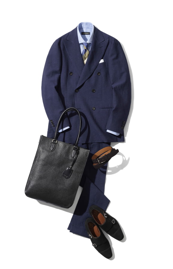 ネイビースーツにブルーシャツという王道のコーディネートですが、白が入ったレジメンタイで爽やかさをプラス。シアサッカーのスーツはカジュアルなので、ベルトやシューズは黒で締めつつ、スエードでカジュアルさを演出。チーフもリネンのものをチョイスして涼しげに魅せましょう。