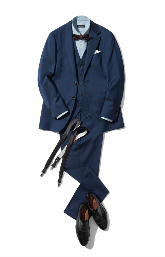スーツ自体がグリーンがかった明るめブルーで少しカジュアルな印象なので、サックスブルーのシャツに柄もののボウタイを合わせて、遊びを効かせたドレスアップスタイルに。スリーピースは、簡単に華やかな雰囲気が作れるので、披露宴や夜のパーティーにもぴったり。