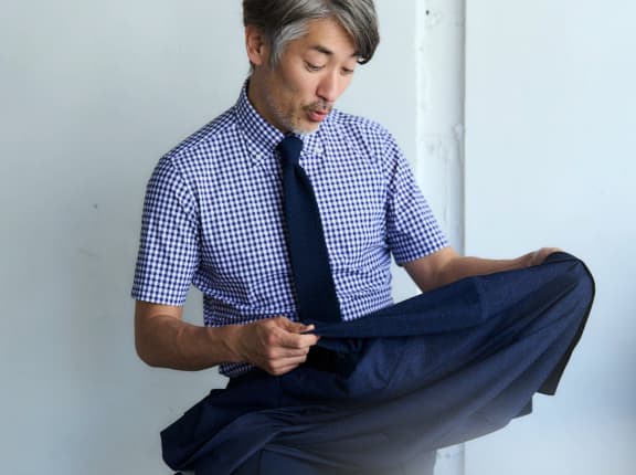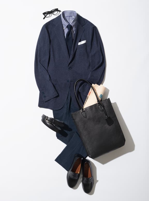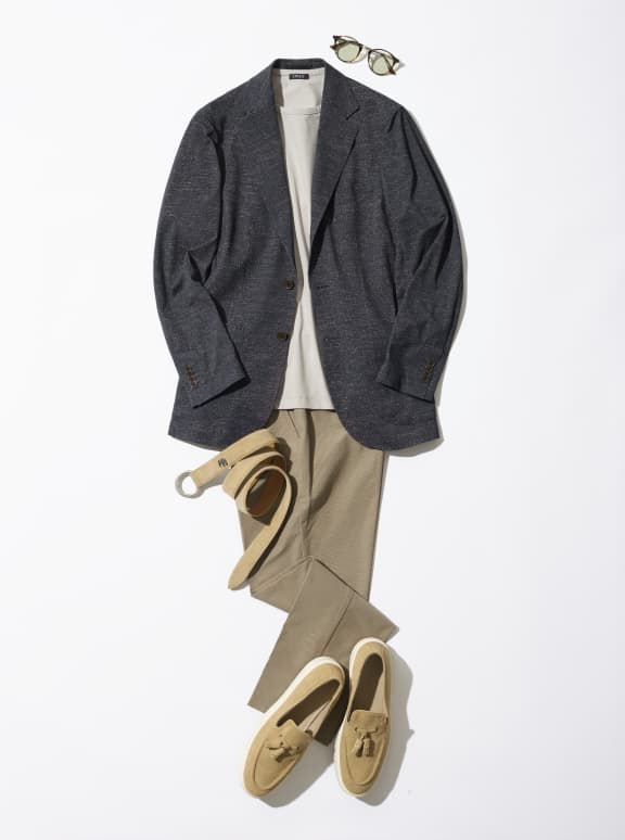 涼しく快適にネイビージャケットにはグレーパンツを合わせるのがお決まりの鉄板コーデですが、今回はあえて同色のネイビーパンツをチョイス。遠目に見ればスーツのようにも見えきちんと感を演出。パンツもONLY GREENのアイテムなので、ストレッチが効いており履きやすい。ジャージージャケットはぺったり平面的に見えがちなので、チェックシャツを合わせて、立体感をプラスしましょう。ローファーとニットタイで軽やかで涼しげな印象に魅せれば、この夏を乗り切るクールなコーディネートの完成です。