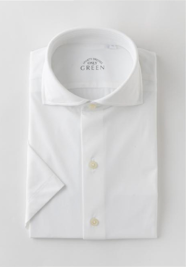 高機能なナイロンストレッチ素材にプリントを施した「オンリー グリーン」のシャツは、一見通常のドレスシャツ。マルチなシーンに対応しながらも、ケアは楽ちん。洗濯機干すだけなのでアイロン掛けは必要ありません。