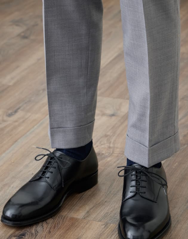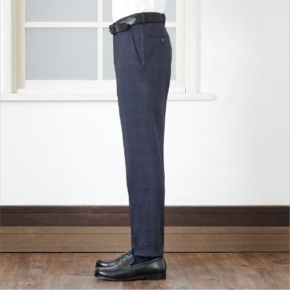「クリース(crease)」とは、スラックスの前後の中心に入れられたラインのことで、別名「センタープレス」とも。脚長効果が期待できるほか、フォルムの立体感が際立つことでシルエットもキレイに見える。ただ、日常の動作や湿気によってクリースは消えていくため、こまめなアイロンがけでキープする必要がある。