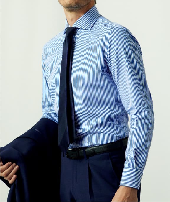 また、素材はおもに中国製の生地ですが、どれも世界最先端の織機で織られたもので、品質とコストパフォーマンスのバランスも秀逸。こうして完成したイタリアンテーラリングシャツは、肩の収まりの良さや腕の動かしやすさ、柔らかで繊細な雰囲気、洗濯に対する耐久性など、満足のいく完成度です。同等のイタリア製ドレスシャツなら2万円は下らないはず。美しさと実用性、コスパも兼ねた、弊社にしか作れない自信作です」(佐藤)