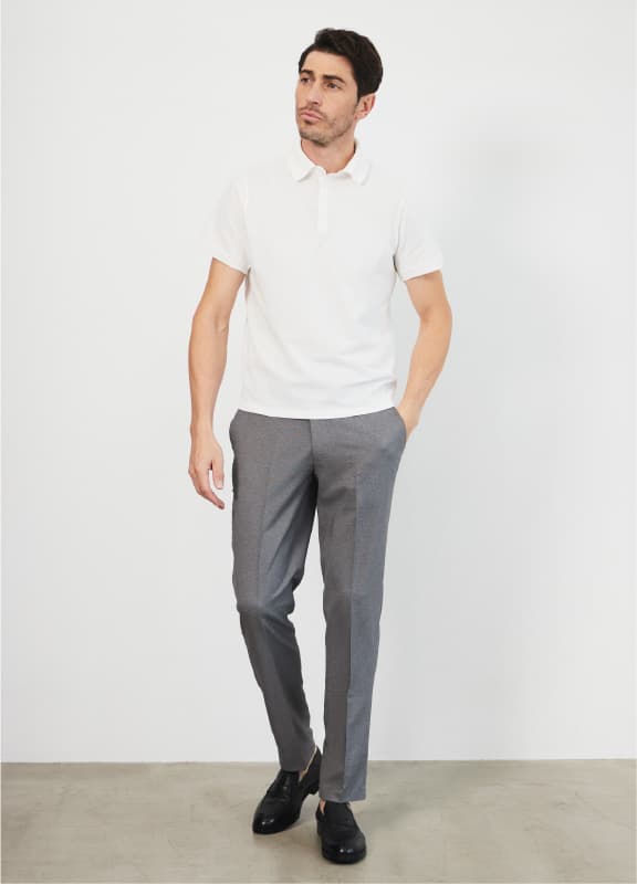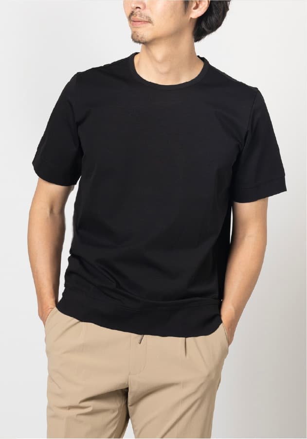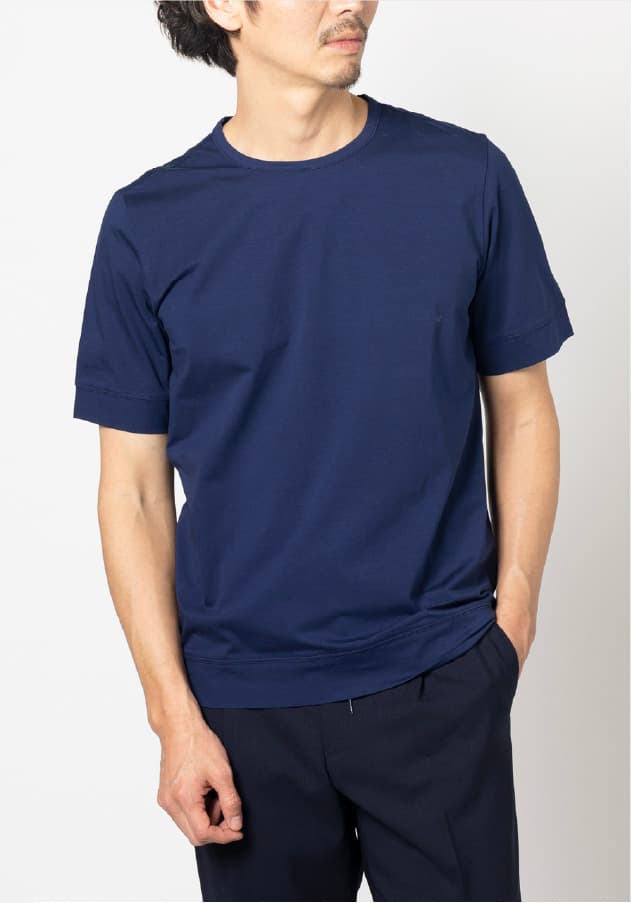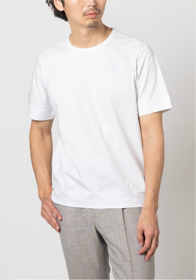 ウエストのシェイプを緩やかにし、袖丈を少し長くした新しいシルエットのTシャツです。テーラーズTより少しリラックス感があり、単品使いからセットアップのスタイリングに最適。