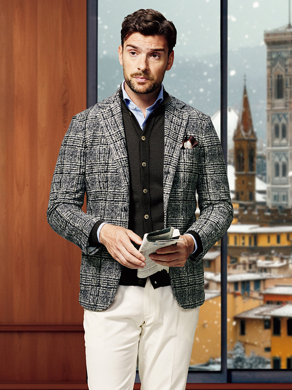 ウールの高級感を保ちながら、軽量性と快適さを兼ねた「ライトメリノジャージー」。芯地類を用いない「サンタルチア ゼロ」モデルも相まって、ストレスフリーな着心地を実現します。メンズ・ウィメンズともに展開します。