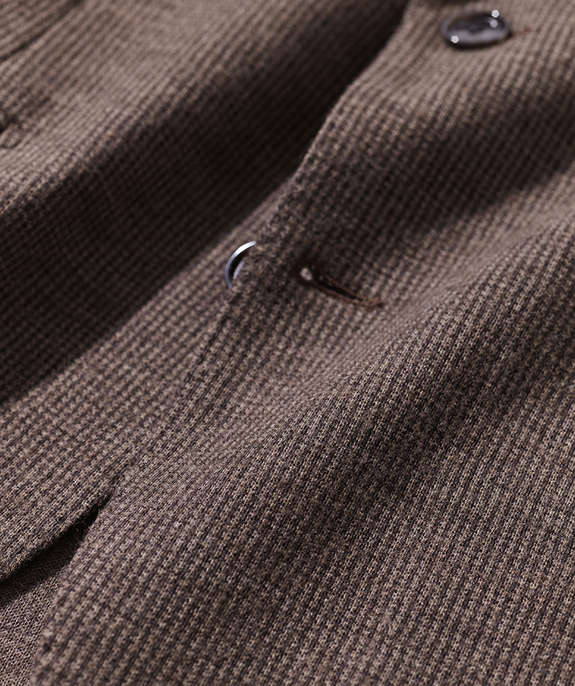 押条 : これはメリノウールにポリエステルをミックスしたONLYのオリジナル生地です。適度な厚みもあるので、冬場に着てもあったかい。