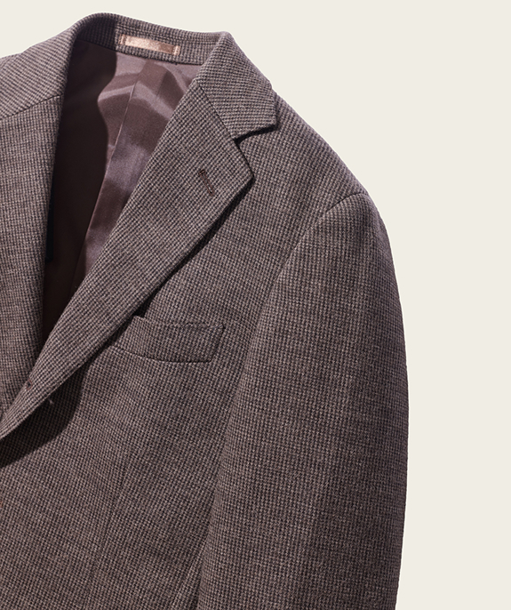 川田 : 胸や肩の立体感もジャージーとは思えないほどしっかり出ていますね。伸縮性があるジャージー素材は縫製や立体感を出すのが難しいはずですが……。このあたりにONLYのテーラーとしての技術力を感じます。