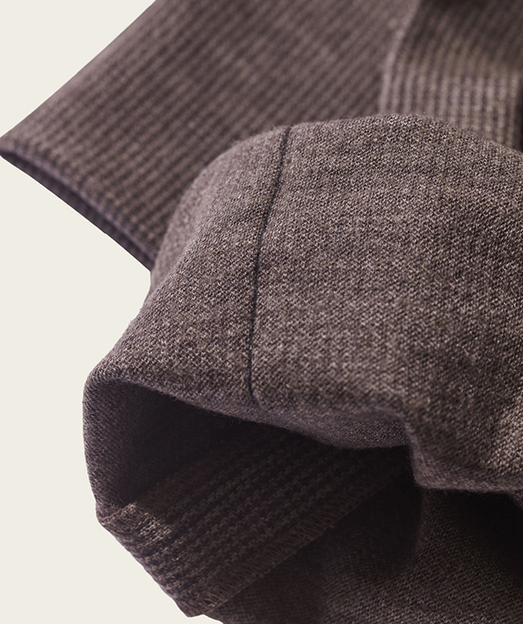 川田 : え!これって本当にジャージー⁉てっきりスーツ生地だと思いました。ジャージーって、ポリエステルやナイロンといった化繊が主流ですが、この生地はとってもナチュラルでしなやか。化繊にありがちな硬さやテカリもなく、ぱっと見はウール100%のフランネル生地に見えます。