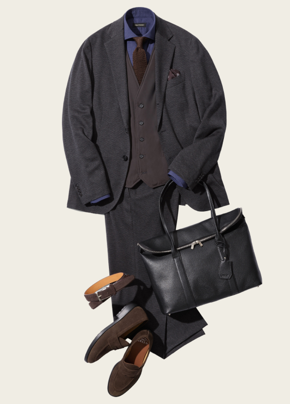 「グレーのライトメリノジャージースーツに合わせたのは、ネイビーのシャンブレーシャツとブラウンのシルクニットタイ。同色の中綿入りベストやブラウンスエードのベルトとシューズでウォーム感のある着こなしを意識しました」