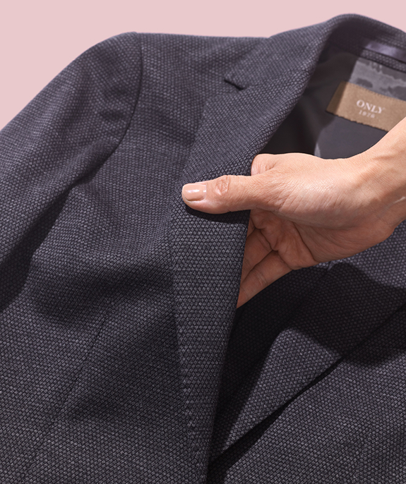 ONLY : 生地を薄手にすることで、既存の「メリノジャージースーツ」より20%以上軽量化しています。さらに仕立ても工夫して、胸元の毛芯を省き、肩まわりには必要な部分にだけ薄い芯を入れて軽やかに仕上げました。